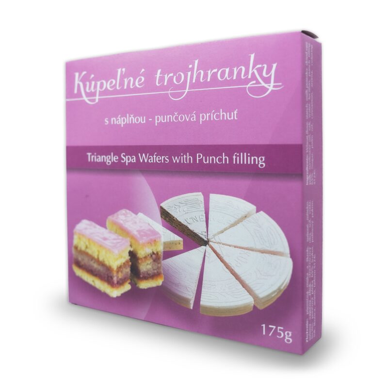 Naše kúpeľné oblátky sa vyrábajú tradičnou receptúrou, ktorá sa odovzdáva z generácie na generáciu. Trojhranky sú oblátky trojholnikového tvaru, ktoré sa výborne mačajú do kávy alebo jedia len tak samotné. Medzi 7 oblátkami sa nachádza krém z našej receptúry. Balenie kartónová krabička o hmotnosti 175g. V krabičke nájdete 8ks oblátok. Zloženie: Pšeničná múka a škrob, sušené mlieko, sušený vaječný žĺtok, slnečnicový olej, soľ, voda, lecitín, punčová plnka 65% (cukor, palmový pokrm. tuk, škorica, aróma, farbivo S124). Môže obsahovať sóju a orechy.